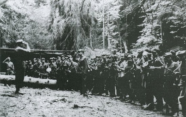 Apel w obozie Grupy Ochrony Sztabu Zgrupowania Partyzanckiego "Błyskawica" mjr. Józefa Kurasia "Ognia" (przyjmuje meldunek). Lato 1946 r.