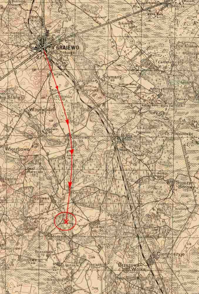 Wycinek mapy Grajewa i okolic (WIG 1929 r.) z zaznaczoną czerwoną linią trasą odwrotu po akcji. Czerwonym okręgiem oznaczono las między wsiami Okół i Modzele, gdzie zgrupowanie partyzanckie mjr. „Bruzdy” biwakowało przez cały dzień 9 maja 1945 r., po wycofaniu się z Grajewa. [kliknij w miniaturkę mapy].