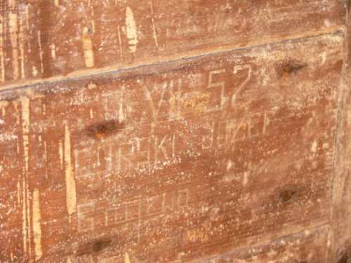 Napisy wyryte przez więźniów na drzwiach celi w PUBP w Grajewie (stan obecny).