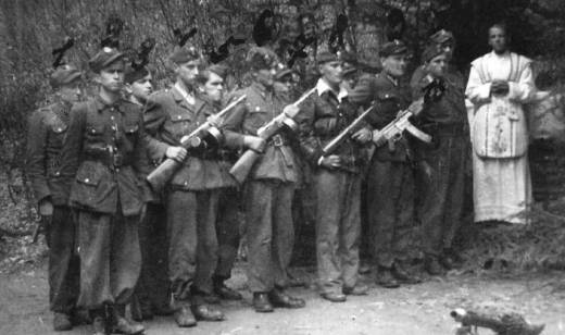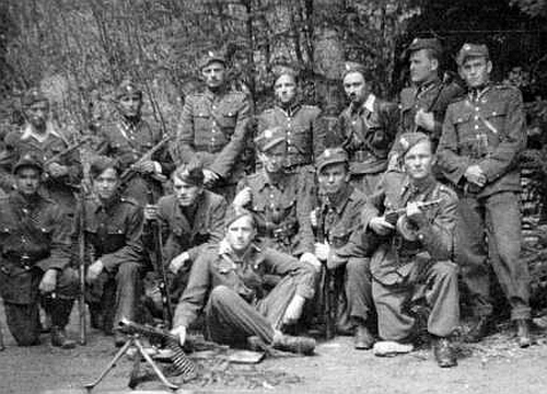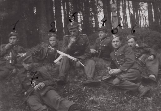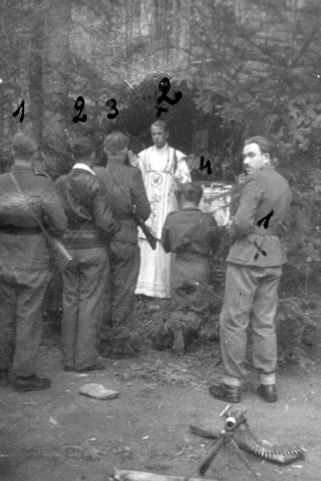Partyzanci PPAN przed Mszą Święta polową: Franciszek Mizgała „Promień”, Julian Twardowski „Jeremi”, „Rogacz”, Józef Witowski „Roland”, Adam Legutko „Młodzik”, „Student”, Bolesław Ziaja „Sokół”, Alojzy Legutko „Arion”, Tadeusz Fida „Lwowiak”, „Szpunder”, Marian Stanek „Zorro”, Michał Cabak „Kuna”, Adolf Cecur „Lew”, Leon Nowakowski „Góral”, Stanisław Szajna „Orzeł”, ks. Władysław Gurgacz „Sem”, maj 1949 r.