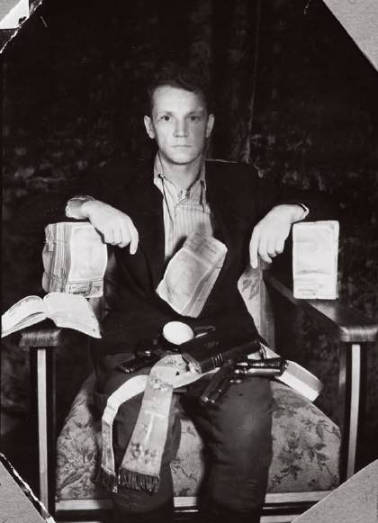 Ks. Władysław Gurgacz. Zdjęcie wykonane w celach propagandowych w WUBP w Krakowie. Dla kompromitacji duchownego celowo wyeksponowano pistolet „Vis”, który kapłan co prawda nosił, ale nigdy go nie użył.