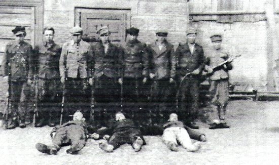 Oddział por. Tadeusza Orłowskiego "Or-Ota". Leżą zabici por. Tadeusz Orłowski "Or-Ot", Helena Jankowska "Dziulia" (w środku) i Czesław Kisielewski "Niewiadomski" zastępca d-cy oddziału. Z tyłu stoją ujęci partyzanci. Zdjęcie z 13 VI 1946 r., prawdopodobnie przed budynkiem PUBP w Grajewie.