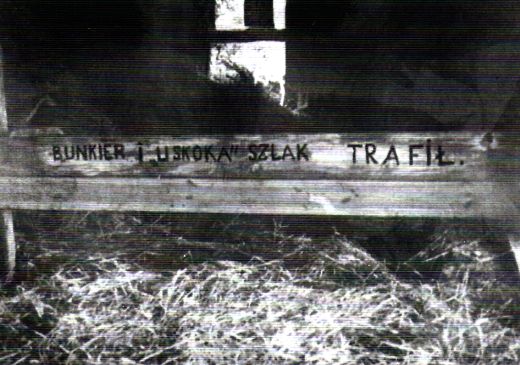 Napis sporządzony przez funkcjonariuszy UB na jednej z desek zapolnicy po zakończeniu operacji w Dąbrówce, 21 V 1949 r.