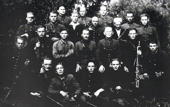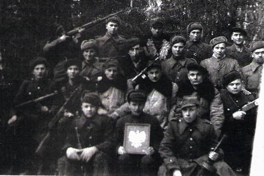 Wiosna 1947 r. Oddział ppor. Anatola Radziwonika „Olecha” (siedzi w środku), na prawo od „Olecha” siedzi sierż. Paweł Klikowicz „Irena” – poległ 17 maja 1947 w starciu z NKWD pod Starodworcami; ciężko ranny w obie nogi osłaniał odwrót grupy po czym zastrzelił się nie chcąc wpaść w ręce Sowietów.
