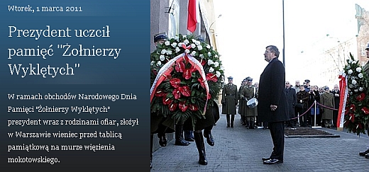 Prezydent podpisał ustawę o ustanowieniu Narodowego Dnia Pamięci "Żołnierzy Wyklętych" 9 lutego tego roku. Projekt ustawy o ustanowieniu Narodowego Dnia Pamięci "Żołnierzy Wyklętych" złożył w ubiegłym roku prezydent Lech Kaczyński w hołdzie – jak napisał w uzasadnieniu – "bohaterom Powstania Antykomunistycznego, którzy w obronie niepodległego bytu Państwa Polskiego, walcząc o prawo do samostanowienia i urzeczywistnienia dążeń demokratycznych społeczeństwa polskiego, z bronią w ręku przeciwstawili się sowieckiej agresji i narzuconemu siłą reżimowi komunistycznemu".