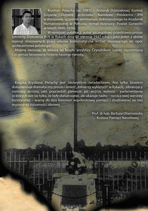 Książka opisuje pokazowy proces doraźny jaki miał miejsce w Rykach 15 stycznia 1947 r., wyrokiem którego za działalność na rzecz niepodległego bytu państwa polskiego skazanych zostało na karę śmierci czterech żołnierzy Zrzeszenia Wolność i Niezawisłość ze zgrupowania mjr. Mariana Bernaciaka "Orlika", a trzech kolejnych na karę więzienia. W bardzo szczegółowy sposób przedstawiała losy sądzonych od momentu aresztowania, poprzez śledztwo, proces sądowy, egzekucję, aż po dalsze losy osób skazanych na karę więzienia.