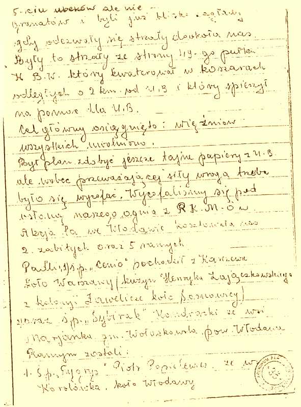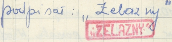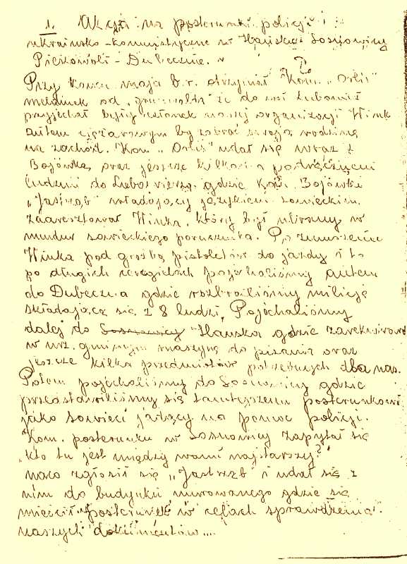 „[…] przy zabójstwie Kosińskiego Józefa we wsi Komarówka gm. Wola Wereszczyńska był rozpoznany sam „Żelazny”. Przyczyny rozpoznania nastąpiły na wskutek tego, że Kosiński Józef uprzednio współpracował z bandą „Żelaznego”, a później zmienił swoje zdanie, poszedł na współpracę z grupą operacyjną K.B, przy której byli pracownicy UB, gdy wszedł do mieszkania „Żelazny” zdjął automat z pleców wymierzył do w/w i powiedział giniesz krew za krew za naszego chłopaka Zielińskiego Bogusława. Zieliński został zabity w bunkrze, który wydał w/w.”