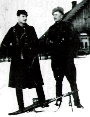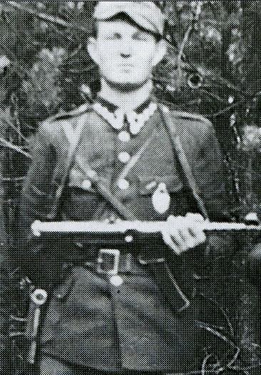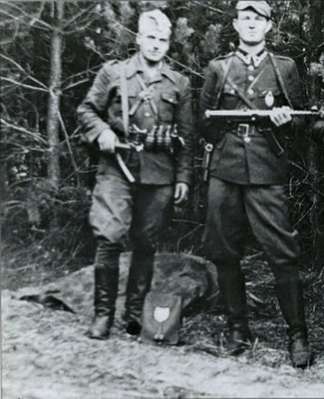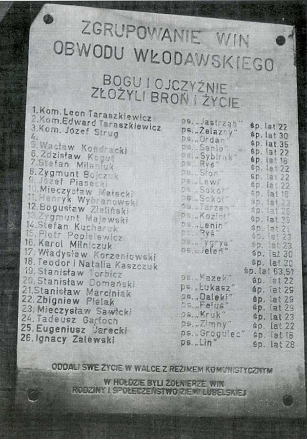 Część oddziału Leona Taraszkiewicza „Jastrzębia” na kwaterze. Stoją od lewej: Eugeniusz Jarecki „Krogulec”, Stanisław Pakuła „Krzewina”, N.N. „Warszawiak”, N.N, Adam Mielniczuk „Fryc”, Feliks Prucnal „Grunwald”, Leon Taraszkiewicz „Jastrząb”. Klęczą od lewej: Ryszard Jakubowski „Kruk”, Piotr Popielewicz „Tygrys”, Antoni Kowalczyk „Huragan” (zdrajca, rozstrzelany przez „Żelaznego” w 1947 r.). Leżą od lewej: Stanisław Dębiński „Bąk”, Zdzisław Kogut (Kogutowski) „Ryś”.