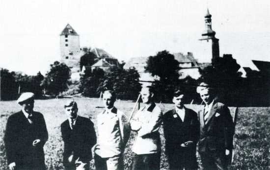 1943 r. Na robotach w Niemczech, Kwerfurt (niem. Querfurt), na zachód od miasta Halle. Od lewej stoją: N.N., Henryk Wybranowski, Władysław Taraszkiewicz, Edward Taraszkiewicz, N.N., N.N. W tle widoczny zamek w Kwerfurcie (Burg Querfurt).