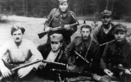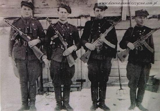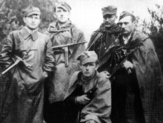 Północne Mazowsze, 1946 r. Żołnierze oddziału por. Wiktora Zacheusza Nowowiejskiego „Jeża”. Od lewej stoją: Stanisław Borzuchowski „Niedźwiedź”, Tadeusz Piotrowski „Zbyszek”, Mieczysław Szczepkowski „Beton”, Zacheusz Nowowiejski „Jeż”, klęczy Mirosław Krajewski „Wiesiek”.