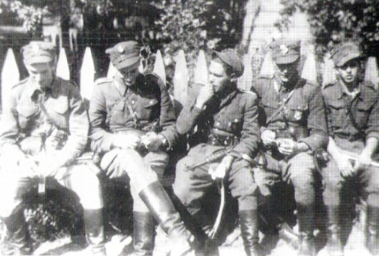 Kadra 4. szwadronu 5. Brygady Wileńskiej AK, od lewej: plut. Zdzisław Badocha "Żelazny", plut. Jerzy Lejkowski "Szpagat", plut. Leon Smoleński "Zeus", NN, kpr. Zbigniew Obuchowicz "Zbyszek".