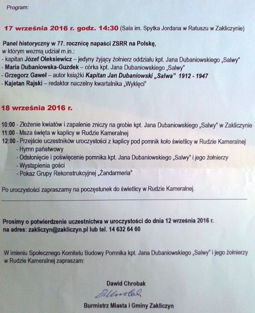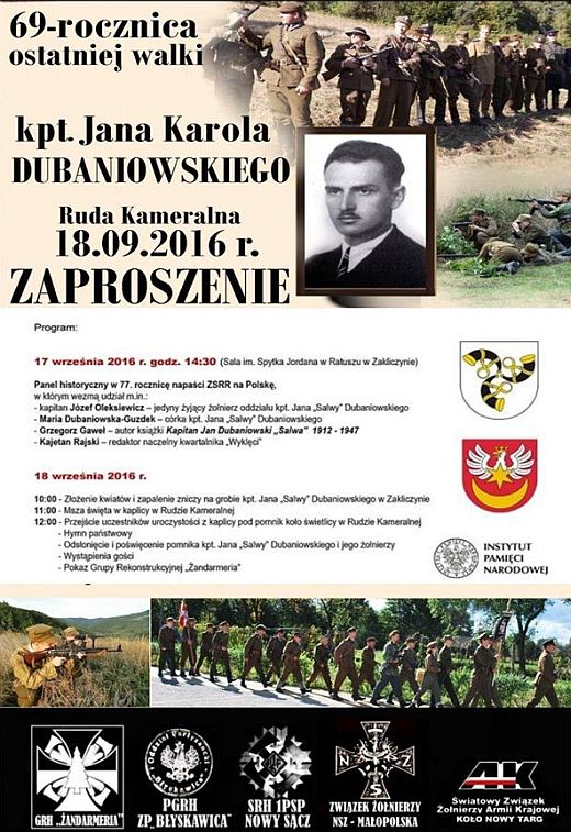 W imieniu organizatorów zapraszam na uroczystości związane z 69. rocznicą ostatniej walki i śmierci kpt. Jana Dubaniowskiego "Salwy", które odbędą się w dniach 17 i 18 września 2016 r. w Zakliczynie oraz Rudzie Kameralnej, gdzie zostanie odsłonięty pomnik poświęcony kpt. "Salwie".