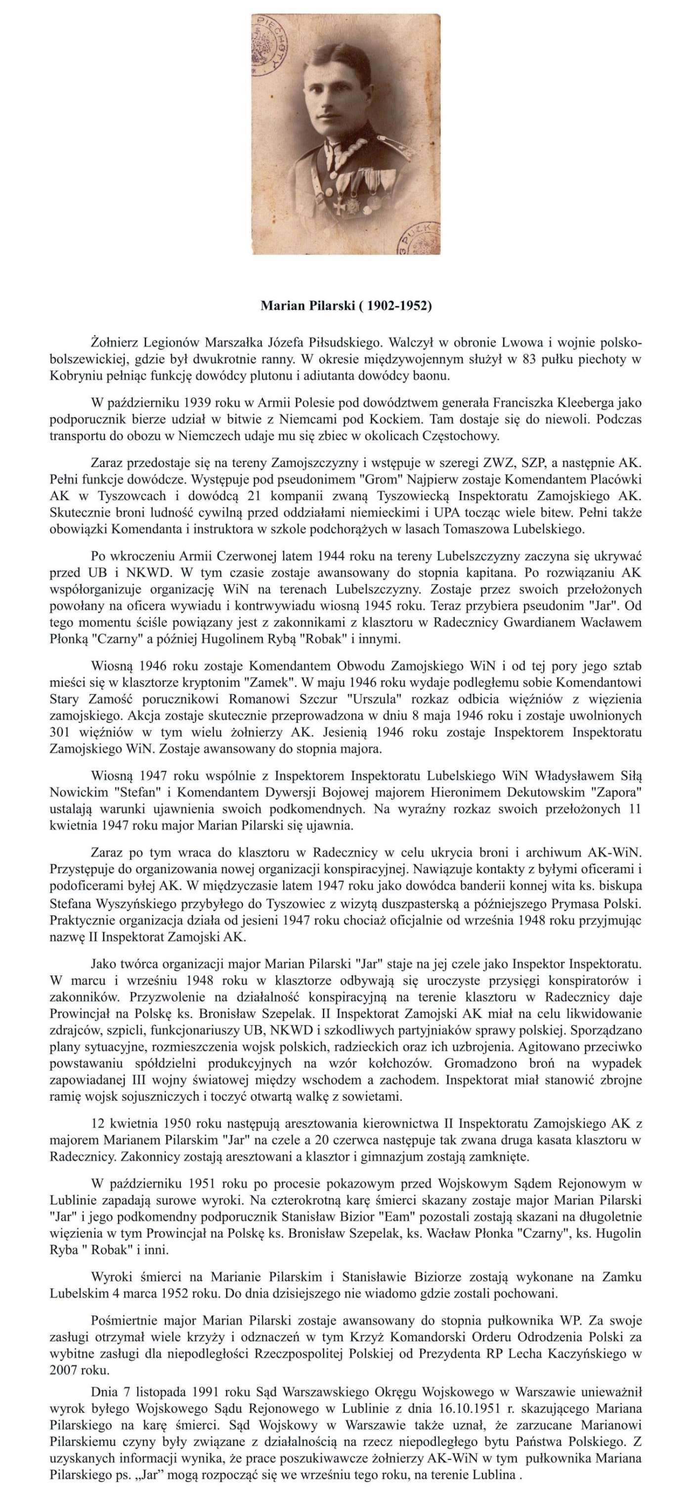 Marian Pilarski „Jar” (1902-1952) to kolejno: żołnierz Marszałka Piłsudskiego, uczestnik walk w obronie Lwowa i wojny polsko-bolszewickiej, obrońca Polski we wrześniu 1939 w Armii Polesie, Komendant Placówki AK Tyszowce, Komendant Obwodu Zamojskiego WiN i Inspektor Inspektoratu Zamojskiego WiN, wreszcie twórca i Inspektor II Inspektoratu Zamojskiego AK ze sztabem w klasztorze w Radecznicy.