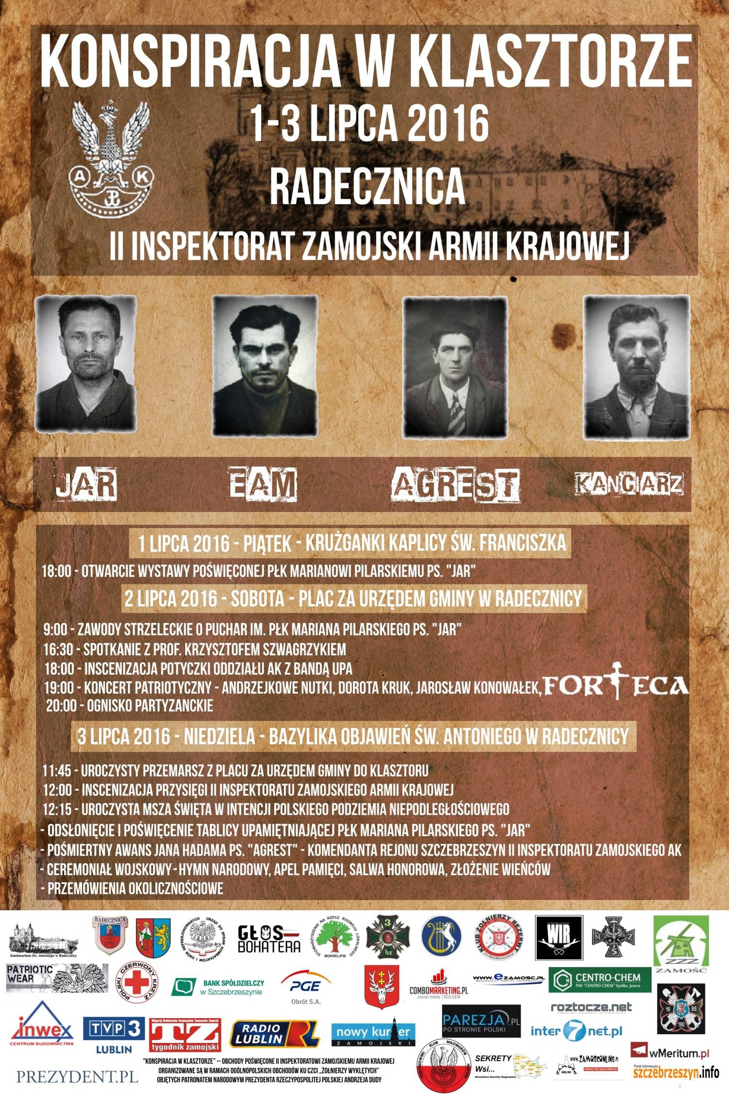 W imieniu organizatorów mam przyjemność zaprosić na uroczystości pod hasłem "Konspiracja w Klasztorze", upamiętniające działalność II Inspektoratu Zamojskiego Armii Krajowej, które odbędą się w dniach 1-3 lipca 2016 r. w Bazylice Św. Antoniego w Radecznicy.