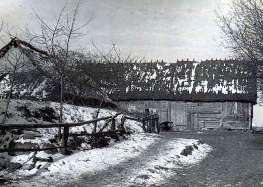 Zabudowania gospodarcze Apolinarego Grabowskiego. W głębi stodoła, z lewej widoczny dach chlewu, pod którym znajdował się schron ppor. "Ryby".