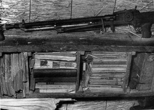 Uzbrojenie ppor. Stanisława Marchewki "Ryby" znalezione w bunkrze znajdującym się w zabudowaniach Apolinarego Grabowskiego w Jeziorku k. Łomży. Zdjęcia wykonane przez funkcjonariuszy SB po zabiciu ppor. "Ryby", 3/4 marca 1957 r. (Archiwum IPN)