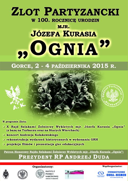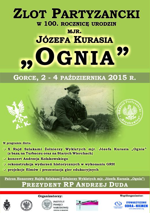 W dniach 2–4 października 2015 r. odbędzie się X edycja rajdu edukacyjnego Szlakami Żołnierzy Wyklętych mjr. Józefa Kurasia „Orła”, „Ognia” oraz Zlot Partyzancki w setną rocznicę urodzin mjr. Józefa Kurasia „Ognia” 1915-2015.