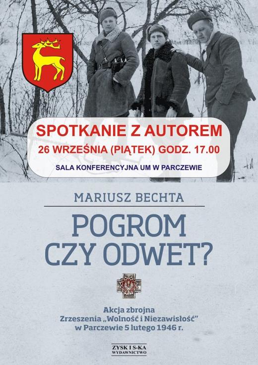 W sobotę 27 września 2014 r. Bialskie Centrum Kultury w Białej Podlaskiej, przy ul. Warszawskiej 11, zaprasza o godz. 17.00 do sali nr 15 na spotkanie z dr. Mariuszem Bechtą, autorem książki "Pogrom czy odwet? Akcja zbrojna Zrzeszenia "Wolność i Niezawisłość" w Parczewie 5 lutego 1946 r.".