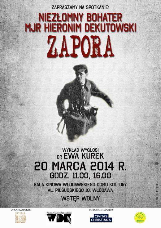 Niezłomny Bohater – mjr Hieronim Dekutowski "Zapora" – wykład dr Ewy Kurek we Włodawie 18 marca 2014 gregg71 Wykład dr Ewy Kurek, Niezłomny Bohater – mjr Hieronim Dekutowski "Zapora", Włodawa, 20 marca 2014 r., godz. 11.00, 16.00 w sali kinowej Włodawskiego Domu Kultury, ul. Piłsudskiego 10 Strona główna>Prawa autorskie> Post navigation Previous postNext post