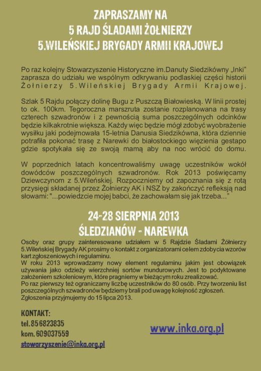 Po raz kolejny Stowarzyszenie Historyczne im. Danuty Siedzikówny "Inki" zaprasza do udziału we wspólnym odkrywaniu podlaskiej części historii Żołnierzy 5. Wileńskiej Brygady Armii Krajowej.
