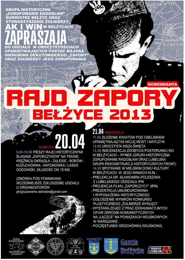 Grupa Historyczna "Zgrupowanie Radosław", Burmistrz Bełżyc oraz Stowarzyszenie Żołnierzy AK i WiN w Bełżycach zapraszają do udziału w uroczystościach upamiętniających postać majora Hieronima Dekutowskiego "Zapory" oraz żołnierzy jego zgrupowania. Szczegółowe informacje znajdują się poniżej na oficjalnym plakacie wydarzenia.