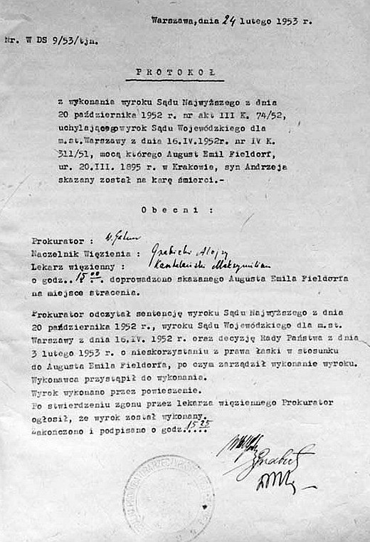 Protokół wykonania kary śmierci na generale Auguście Emilu Fieldorfie "Nilu".
