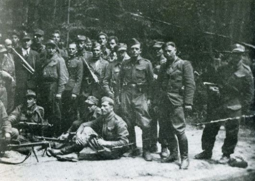 Grupa żołnierzy z oddziału „Uskoka” podczas koncentracji w lasach kozłowieckich (Stary Tartak) w lipcu 1944 r. Na pierwszym planie stoją: czwarty od lewej – ppor. cz.w. Zdzisław Broński ps. „Uskok”, piąty – sierż. Kocyła ps. „Jastrząb”, szósty – Zygmunt Libera ps. „Babinicz”; siedzą: pierwszy z prawej – Jan Mendel ps. „Czarny”.