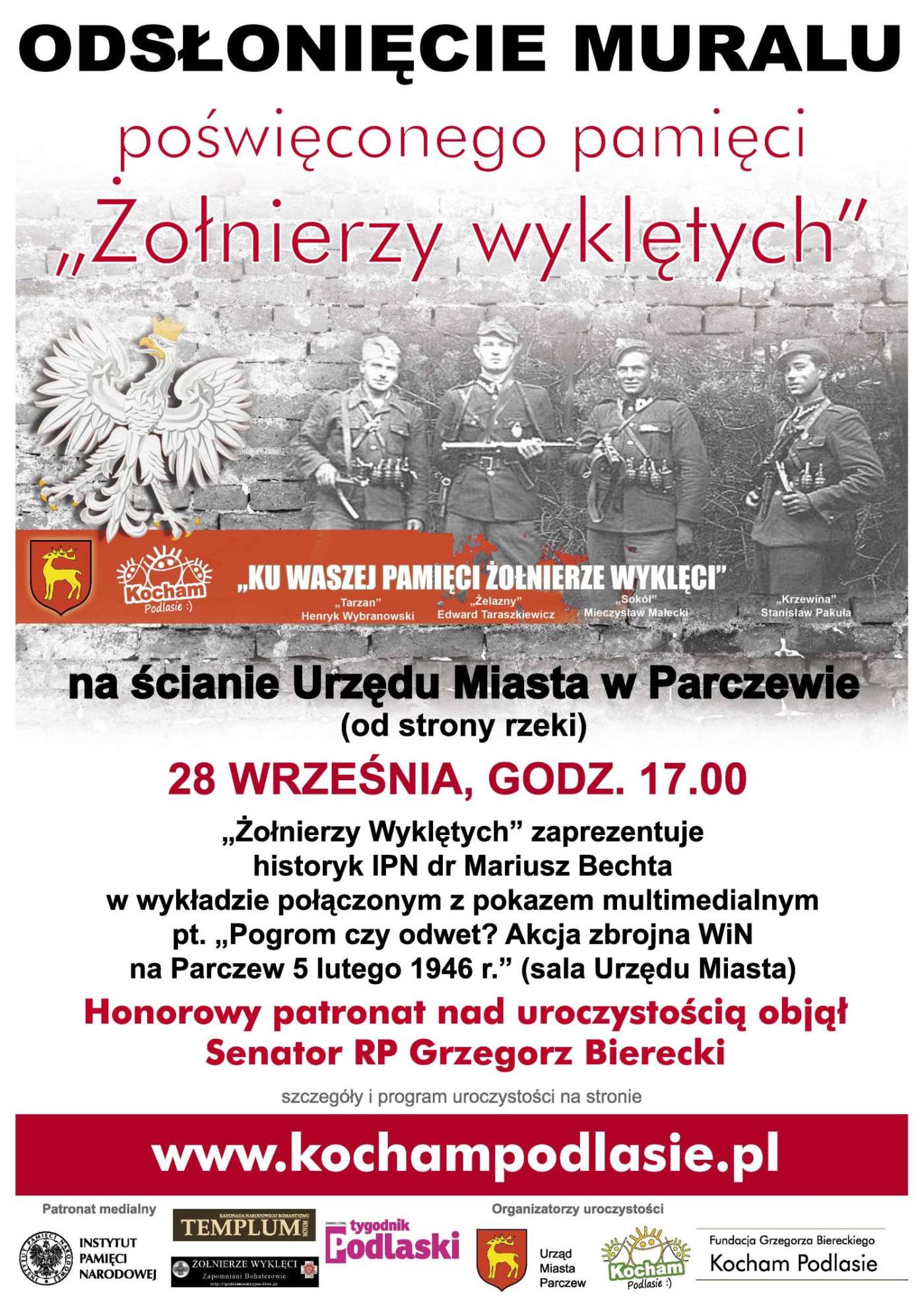 W imieniu twórców i organizatorów zapraszam na odsłonięcie w dniu 28 września 2012 r. (piątek) o godz. 17.00 w Parczewie, muralu poświęconego Żołnierzom Wyklętym z oddziału ppor. Edwarda Taraszkiewicza "Żelaznego". Uroczystość uświetni wykład dr. Mariusza Bechty – historyka z Instytutu Pamięci Narodowej pt. "Pogrom czy odwet? Akcja zbrojna WiN na Parczew 5 lutego 1946 r.", który zostanie wygłoszony w Urzędzie Miasta w Parczewie.