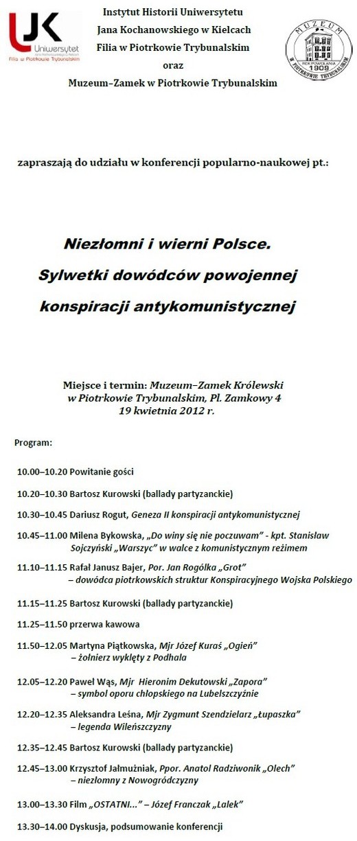 Instytut Historii Filii UJK w Piotrkowie Trybunalskim oraz Muzeum–Zamek zapraszają na konferencję popularnonaukową pt. Niezłomni i wierni Polsce. Sylwetki dowódców powojennej konspiracji antykomunistycznej. Konferencja odbędzie się 19 kwietnia 2012 r. (czwartek) w Muzeum w Piotrkowie Trybunalskim, Plac Zamkowy 4.