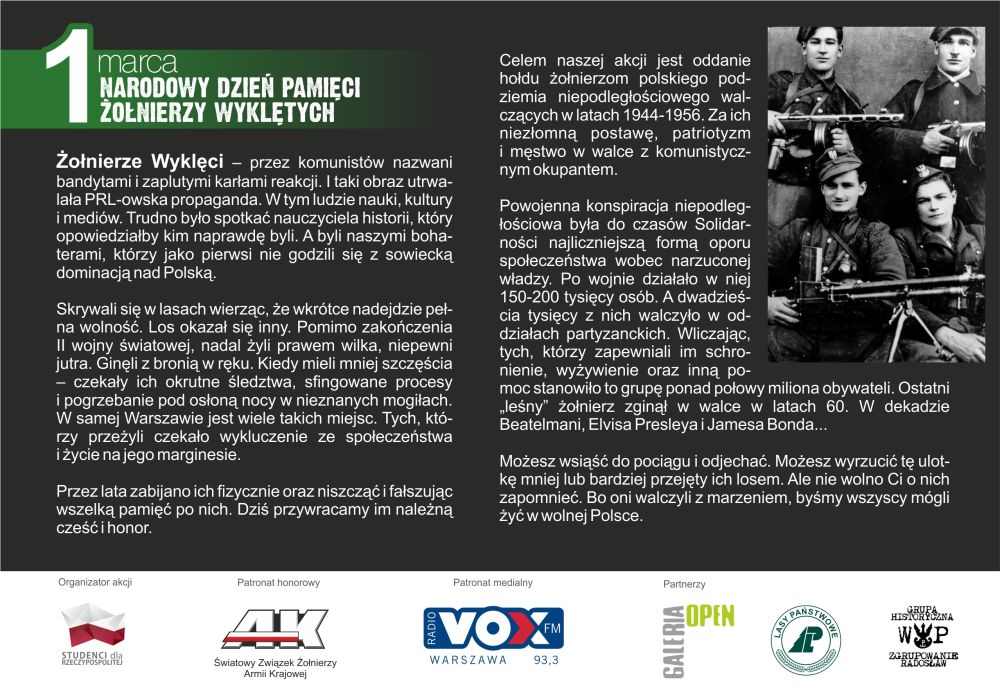 Przez lata PRLu władza robiła wszystko, by wymazać ich z historii i z pamięci obywateli. To co wydarzy się 1 marca na Dworcu Centralny, to dowód na to, że się nie udało. A kiedy młodzi biorą historię w swoje ręce – znaczy, że będzie się działo!