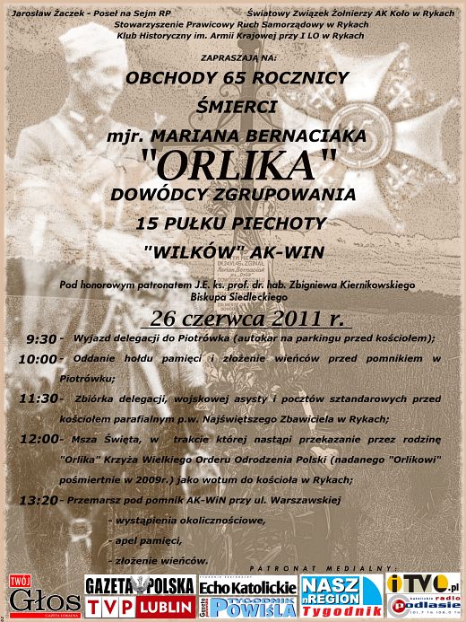 W niedzielę, 26 czerwca 2011 r. przypada 65 rocznica śmierci majora Mariana Bernaciaka ps. "Orlik". Honorowy patronat tej uroczystości przyjął Biskup Siedlecki Zbigniew Kiernikowski, Pasterz Diecezji. Na sumie o godz. 12.00 w kościele parafialnym w Rykach zostanie odprawiona uroczysta Msza Święta za majora "Orlika", dowódcę zgrupowania partyzanckiego 15. Pułku Piechoty Wilków AK-WiN oraz za Poległych, Pomordowanych i Zmarłych Jego Żołnierzy. Podczas tej uroczystości nastąpi przekazanie przez rodzinę "Orlika", jako wotum do kościoła w Rykach, Krzyża Wielkiego Orderu Odrodzenia Polski nadanego pośmiertnie przez prezydenta RP śp. Lecha Kaczyńskiego w 2009 roku.