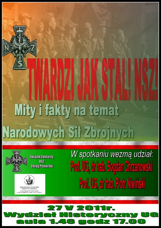 Naukowe Koło Historyków Uniwersytetu Gdańskiego pragnie zaprosić Państwa na konferencję naukową pt. "Silni jak Stal! NSZ!", która odbędzie się 27 maja o godzinie 17.00 w auli Wydziału Historycznego Uniwersytetu Gdańskiego (sala 1.46). Tematem sympozjum będą "Żołnierze Wyklęci" Narodowych Sił Zbrojnych. W spotkaniu wezmą udział wybitni znawcy przedmiotu – prof. dr hab. Bogdan Chrzanowski oraz prof. dr hab. Piotr Niwiński.