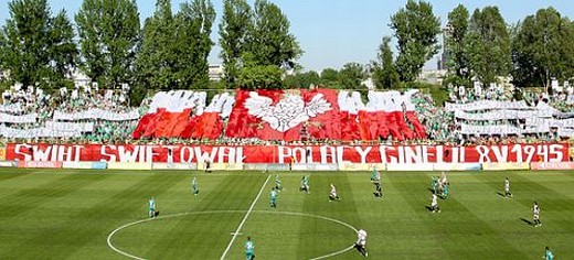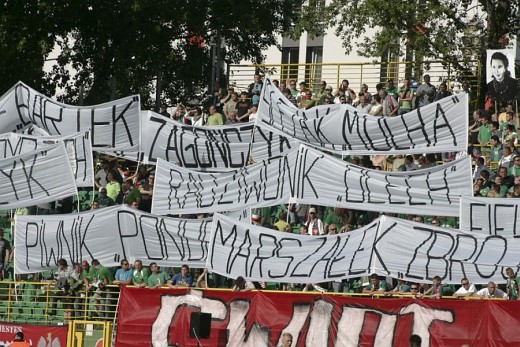 Kibice przygotowali również wielki, biało-czerwony transparent z napisem "Świat świętował – Polacy ginęli, 8 V 1945 r.". Na trybunach pojawił się też ogromny Orzeł Biały na tle biało-czerwonych barw.