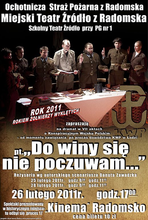 Stowarzyszenie Miejski Teatr Źródło z Radomska i Prezes Zarządu Danuta Zawadzka oraz Ochotnicza Straż Pożarna z Radomska serdecznie zapraszają na dramat w VII aktach "DO WINY SIĘ NIE POCZUWAM…" o Konspiracyjnym Wojsku Polskim – od momentu zawiązania po proces dowództwa KWP w Łodzi. Reżyseria wg autorskiego scenariusza Danuta Zawadzka. W opracowaniu scenariusza oparto się między innymi na materiałach z Oddziału Instytutu Pamięci Narodowej z Łodzi.