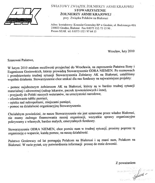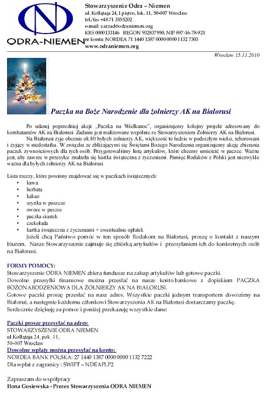 Stowarzyszenie ODRA-NIEMEN z Wrocławia po raz trzeci organizuje akcję pomocy byłym żołnierzom AK mieszkającym na Białorusi. Poprzednie zadania w skali ogólnopolskiej udały się bardzo dobrze, dlatego ponawiamy nasz apel o pomoc przed nadchodzącymi Świętami Bożego Narodzenia. Jednocześnie poszukujemy nowych partnerów i przyjaciół tego projektu. Prosimy w imieniu Stowarzyszenia Żołnierzy AK na Białorusi o wszelką pomoc, zwłaszcza o pomoc informacyjną o akcji. Sprawozdania i zdjęcia z odbytych zadań dotyczących pomocy byłym żołnierzom AK na Białorusi, znajdą Państwo na naszych stronach. Przedstawiamy także list Pani Prezes Stowarzyszenia Żołnierzy AK na Białorusi Weroniki Sebastianowicz o formach współpracy między naszymi organizacjami.