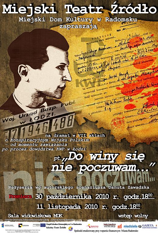 Miejski Teatr Źródło oraz Miejski Dom Kultury w Radomsku zapraszają na dramat w VII aktach "DO WINY SIĘ NIE POCZUWAM…" o Konspiracyjnym Wojsku Polskim – od momentu zawiązania po proces dowództwa KWP w Łodzi. Reżyseria wg autorskiego scenariusza – Danuta Zawadzka.