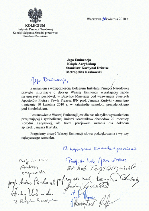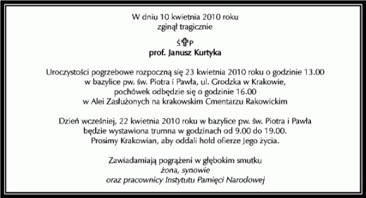 Uroczysty pogrzeb tragicznie zmarłego w katastrofie samolotowej pod Smoleńskiem prezesa IPN miał się odbyć w piątek o godz. 13. Rozesłano już zaproszenia, wydrukowano wejściówki dla dziennikarzy i przygotowano kryptę. Kolegium IPN zamieściło nawet w Internecie podziękowania dla biskupa krakowskiego, kardynała Stanisława Dziwisza.