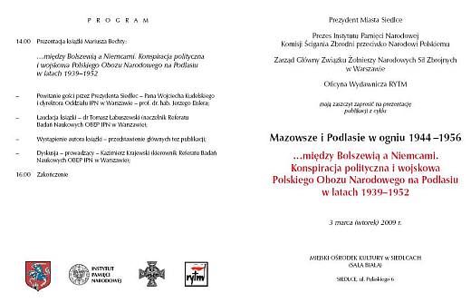W imieniu autora – Mariusza Bechty, zapraszam na prezentację książki z cyklu Mazowsze i Podlasie w ogniu 1944-1956, pt. "…między Bolszewią a Niemcami. Konspiracja polityczna i wojskowa Polskiego Obozu Narodowego na Podlasiu 1939-1952", która odbędzie się 3 marca (wtorek) 2009 roku o godz. 14:00, w Miejskim Ośrodku Kultury w Siedlcach (Sala Biała), ul. Pułaskiego 6.