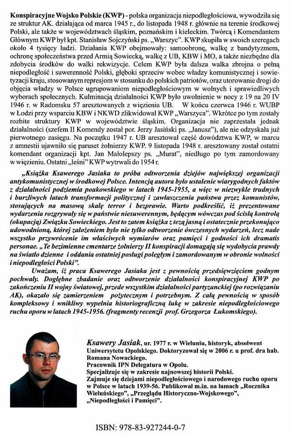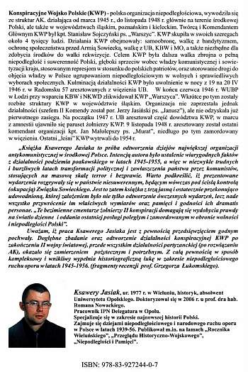Książka dr. Ksawerego Jasiaka pt. „Działalność partyzancka Konspiracyjnego Wojska Polskiego. Z dziejów II Konspiracji w środkowej Polsce w latach 1945-1955” powstała w wyniku żmudnych penetracji archiwów IPN, dzięki dostępowi do odtajnionych w ostatnim okresie akt, m.in. Informacji Wojskowej, relacji osób pamiętających tamte dni, zarówno tych będących ofiarami, jak i tych będących katami, dzięki możliwości dotarcia do unikalnych, opatrzonych wiarygodnymi podpisami zdjęć z prywatnych archiwów.