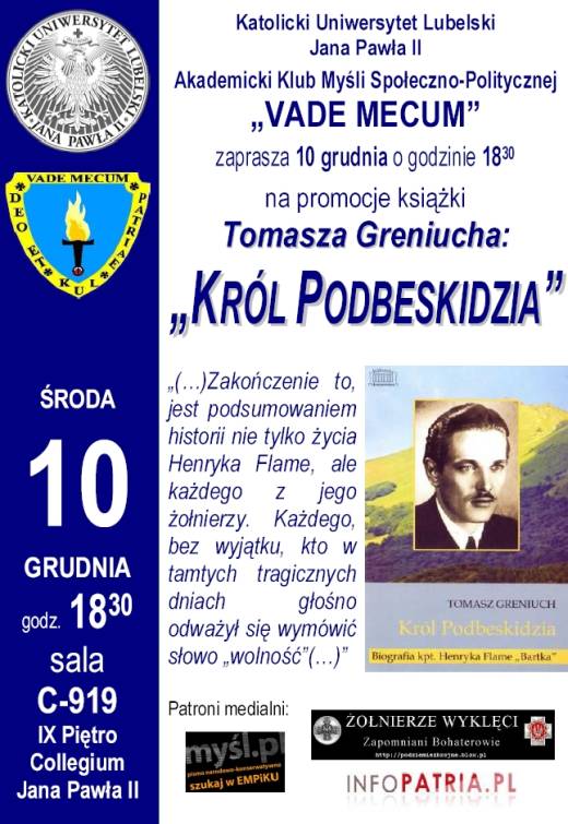 Tomasza Greniucha pt. "Król Podbeskidzia". Biografia kpt. Henryka Flame "Bartka", która odbędzie się w Lublinie, 10 grudnia 2008 r. (środa) o godz 18:30 w