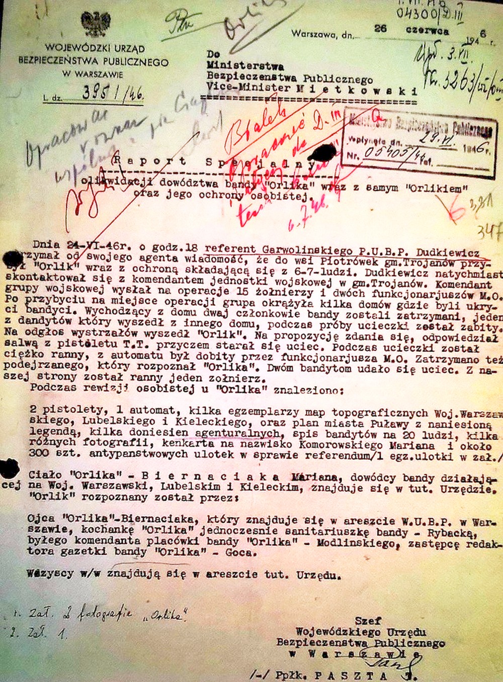 Raport szefa WUBP płk. Paszty do MBP o likwidacji mjr. Mariana Bernaciaka "Orlika". Fot. AIPN.