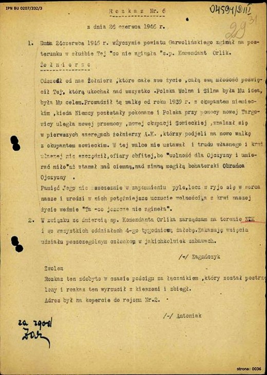 Rozkaz mjr. Franciszka Jaskólskiego "Zagończyka" informujący o śmierci Mariana Bernaciaka "Orlika". Fot. Archiwum IPN (IPN BU 0207/332/3)