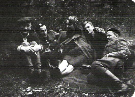 Pierwsza wizyta u por. cc Jana Piwnika "Ponurego". Od lewej: "Szary", Stanisław Pałac "Mariański" z żoną i synem, ppor. Władysław Czerwonka "Jurek".