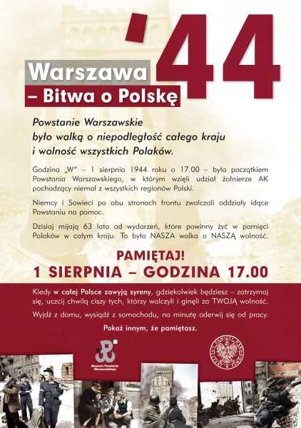 W związku z 63. rocznicą wybuchu Powstania Warszawskiego Muzeum Powstania Warszawskiego oraz Instytut Pamięci Narodowej zainicjowały akcję Warszawa ’44 – Bitwa o Polskę na rzecz nadania obchodom kolejnych rocznic tego wydarzenia charakteru ogólnopolskiego. W ten sposób chcemy przypomnieć Polakom, że Powstanie Warszawskie było ostatnią próbą ocalenia kraju przez zastąpieniem jednej okupacji – niemieckiej przez drugą – sowiecką, oraz że stanowiło ono wspólną walkę o Niepodległość Polski, a nie jedynie lokalny bój o Warszawę.