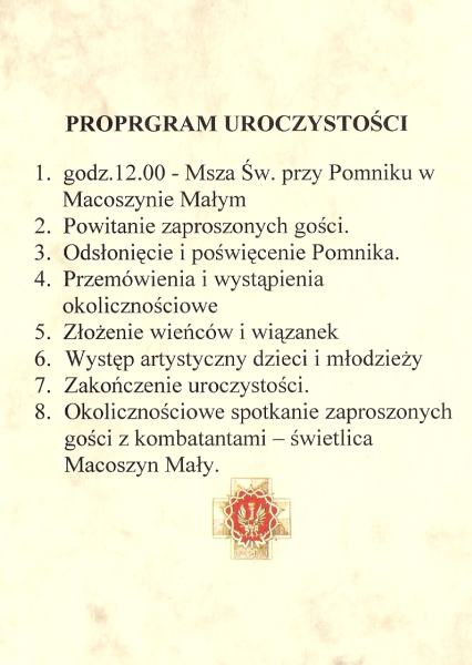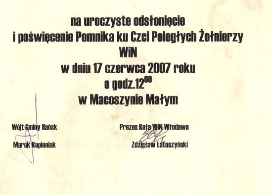 Zrzeszenie Wolność i Niezawisłość Koło we Włodawie oraz Wójt Gminy Hańsk zapraszają na uroczystości odsłonięcia i poświęcenia Pomnika ku Czci Poległych Żołnierzy Obwodu włodawskiego WiN Henryka Wybranowskiego ps. „Tarzan” i Jana Torbicza ps. „Łoś”, które odbędą się w niedzielę, 17 czerwca 2007 r. o godz. 12:00 w Macoszynie Małym (woj. lubelskie, pow. Włodawa – dojazd drogą Włodawa – Chełm).
