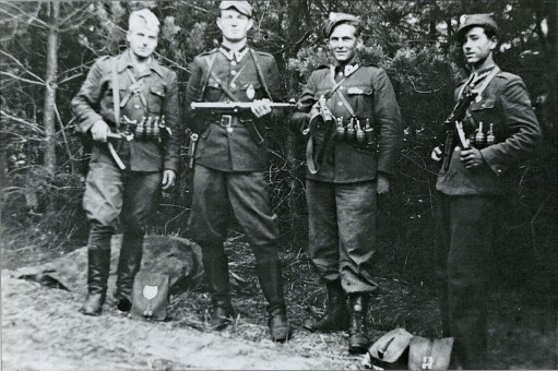 Czerwiec 1947 r. Żołnierze Obwodu WiN Włodawa. Stoją od lewej: Henryk Wybranowski „Tarzan”, poległ w Macoszynie 6 XI 1948 r., d-ca por. Edward Taraszkiewicz „Żelazny”, poległ 6 X 1951 r. w Zbereżu n/Bugiem, Mieczysław Małecki „Sokół” poległ w Hańsku 11 X 1947 r., Stanisław Pakuła „Krzewina” (skazany na wieloletnie więzienie).