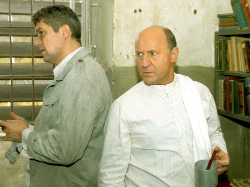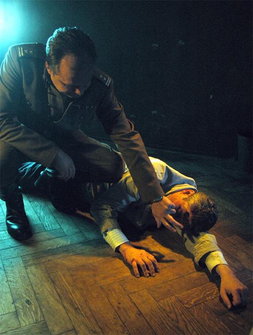 Andrzej Zieliński jako Kazimierz Moczarski i Piotr Fronczewski jako Jürgen Stroop w spektaklu "Rozmowy z katem".