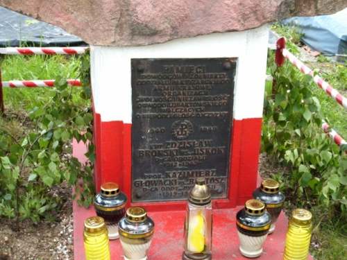 Nowogród. Tablica na pomniku w miejscu śmierci kpt. "Uskoka". Kpt. Zdzisław Broński „Uskok” zginął w bunkrze w Dąbrówce, jego ciało zabrali ubecy a miejsce pochówku do dziś pozostaje nieznane.