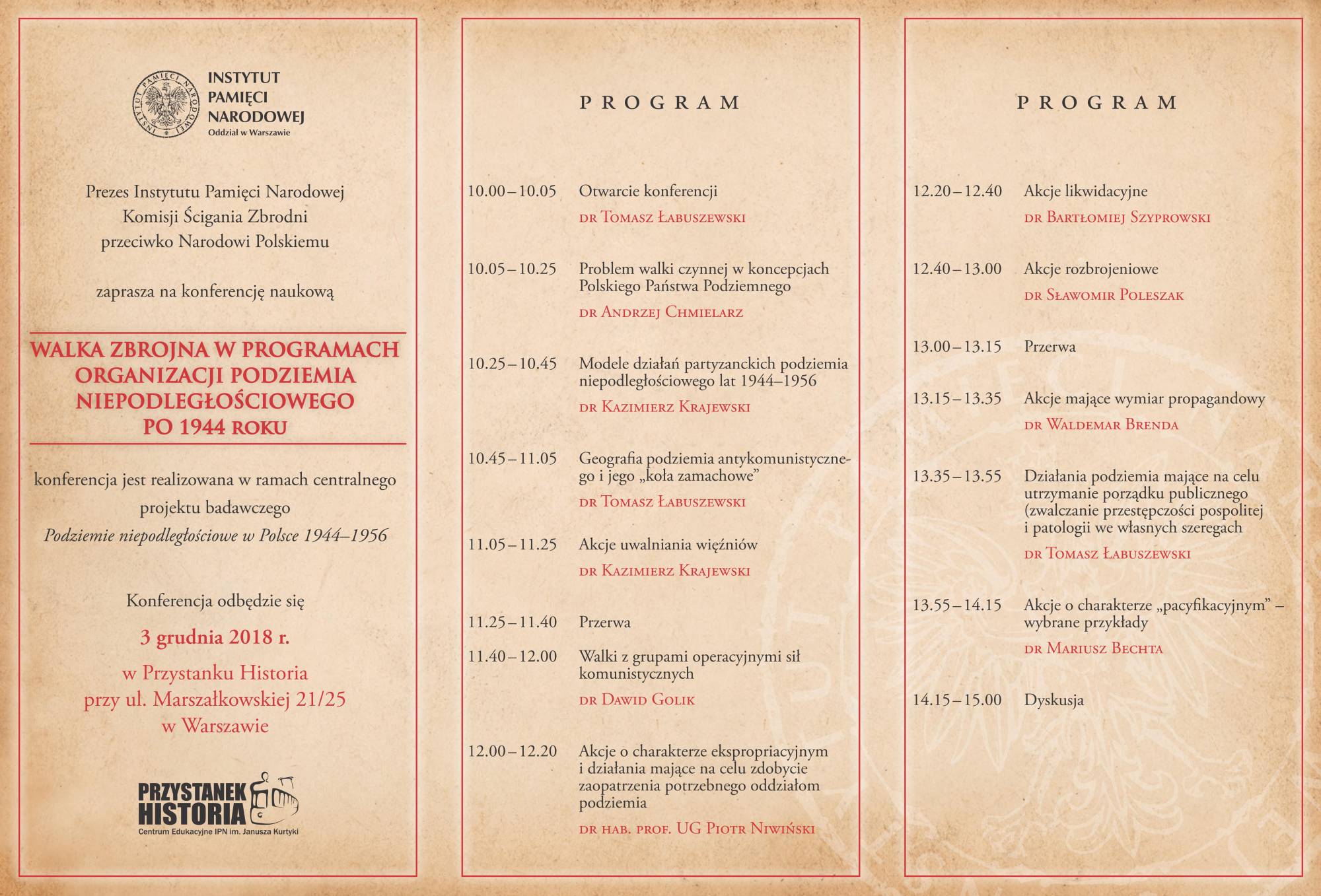 Sympozjum będzie poświęcone problematyce akcji czynnej podejmowanej przez konspirację niepodległościową w okresie dyktatury komunistycznej. Po przypomnieniu koncepcji walki czynnej przyjętych w wojskowych strukturach Polskiego Państwa Podziemnego podczas okupacji niemieckiej zostanie omówiona „geografia” podziemia antykomunistycznego i zjawiska oraz mechanizmy jego funkcjonowania – swego rodzaju „koła zamachowe”, nadające mu dynamikę. Prelegenci scharakteryzują modele działań partyzanckich w latach 1944–1956. W kolejnych referatach będzie można zapoznać się z poszczególnymi kategoriami akcji zbrojnych – takimi jak uwalnianie więźniów, walki z grupami operacyjnymi sił komunistycznych, akcje ekspropriacyjne, zaopatrzeniowe, rozbrojeniowe i likwidacyjne, a także mające wymiar propagandowy. W kolejnych referatach zostaną przedstawione działania podziemia mające na celu utrzymanie porządku publicznego oraz zwalczanie przestępczości pospolitej i patologii we własnych szeregach, a także akcje szczególnie drastyczne, tj. o charakterze „pacyfikacyjnym”.